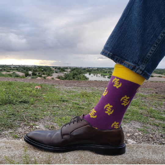 This is one of the socks in our Adinkra Collection. Adinkra symbols are widespread throughout Ghana. They are representations of beliefs and ideals held by the Asante (also known as Ashanti) people of Ghana. These symbols have historical and philosophical significance and were originally printed on cloth which Asante royals wore on important occasions. Since its origins of appearing on cloth, adinkra symbols are now often seen on sculptures, buildings, and furniture, among others.